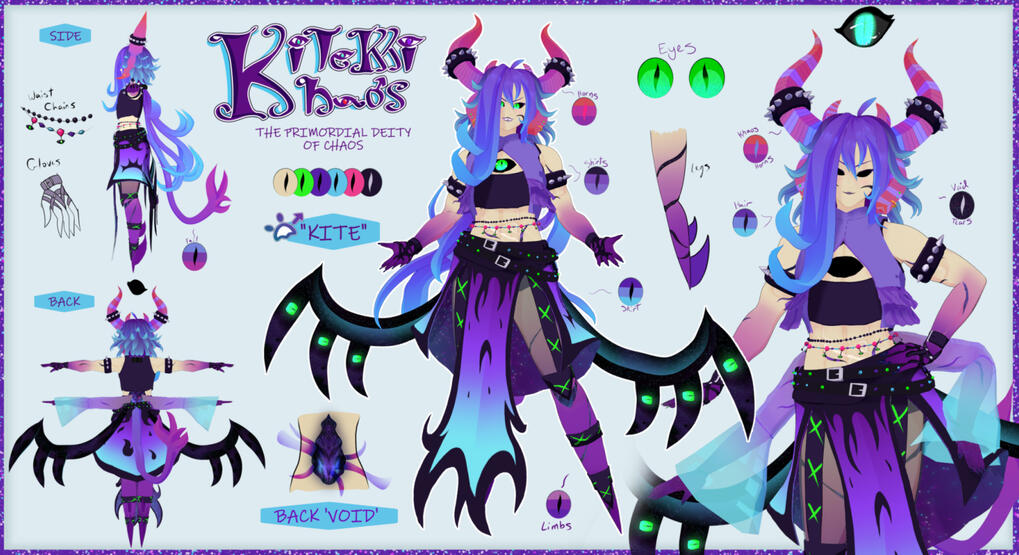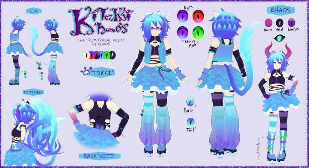 Kitekki is a physical manifestation of the Primordial Deity of Khaos. They have many forms, names, titles, and are older than Time, itself. While they can hold any appearance, there are certain details that remain consistent across all of them, including the scars they've gained since materializing, their horns, and the Eye of Khaos.They chose a cat-like form when deciding on a physical appearance purely for the cat's known chaotic levels. It was the closest thing to conveying their true identity without burning mortal minds. Similarly, like a cat, Khaos decided they would give themselves 9 "Resets" on the mortal realm before they would have to return to The Void.Kitekki is currently on 'Reset' 5 and each of their scars relate to one of their previous deaths.Currently, they have two main forms they use, a Mortal (Cat) Disguise: Tekk (He/Him) and a Deity Form: Kite (They/Them). Khaos has no concept of gender rules as they're an amorphous blob of Primordial Ooze in their natural state.